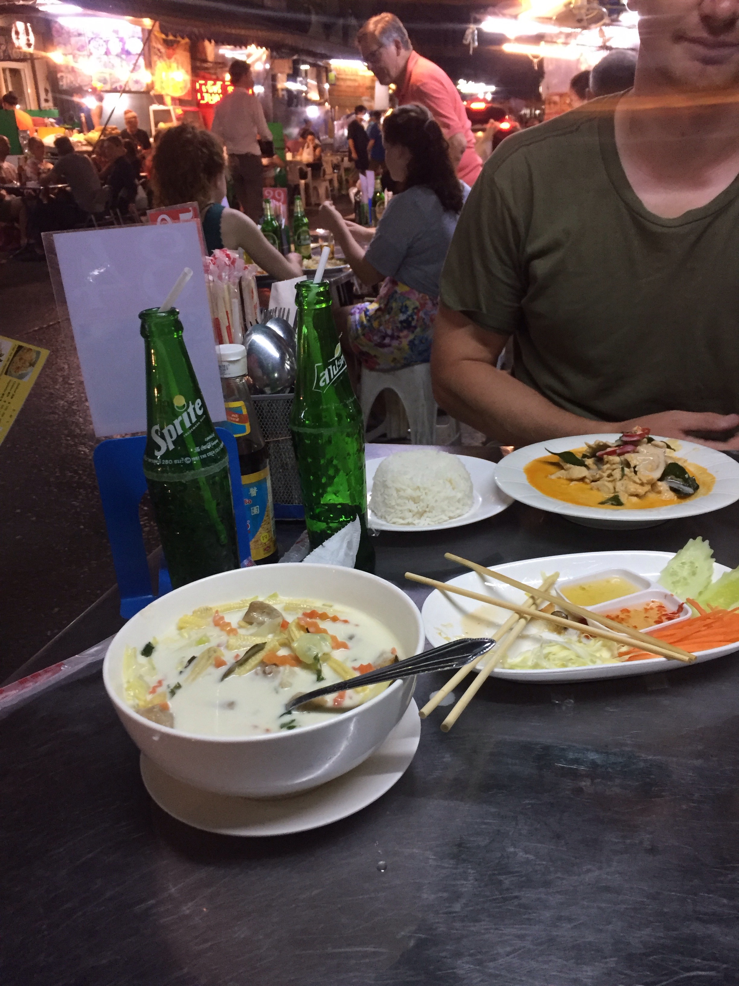 Silom Soi 20. Our local street food hangout. Just around the corner from our hostel is a well known street food alley called Silom Soi 20. So far in five days we have eaten dinner there 5 nights and tried each of the main restaurants. The food is very cheap and you eat roadside on little plastic chairs next to seafood and produce, having to avoid the cars and scooters that drive down it. All of the food is cooked fresh as you order and it’s always really busy meaning a high turnover of fresh produce being used. A main Thai meal (a curry, noodles, pad Thai or soup) is roughly $2.50-$3.50NZD and a large beer costs around $4.50NZD.